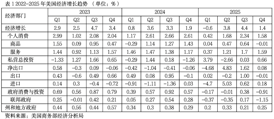 如表1所示,2025年第四季度经济增长仅为1.4%,低于市场预期的2.8%,也低于2023年的3.4%和2024年的1.9%,表明经济增长的确放缓了。国民生产总值包括四大部分:个人消费、私营部门投资、净出口和政府消费与投资。对美国而言,个人消费占国内生产总值的三分之二以上,私营部门投资占约15%,净出口几乎为零(长期贸易赤字),政府消费与投资约10%。