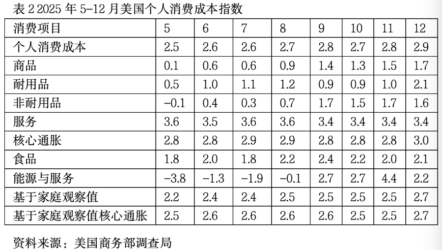 与2026年2月13日美国劳工部公布的消费价格指数相比,个人消费成本指数表明通货膨胀并没有出现下跌趋势。美国劳工部数据显示,通货膨胀(CPI)由2025年11月的2.7%降至12月的2.4%,同期的核心通胀由2.6%降至2.5%。来自不同部门的同样揭示美国物价变化的两个通胀指标“打架”,金融投资者空欢喜一场。